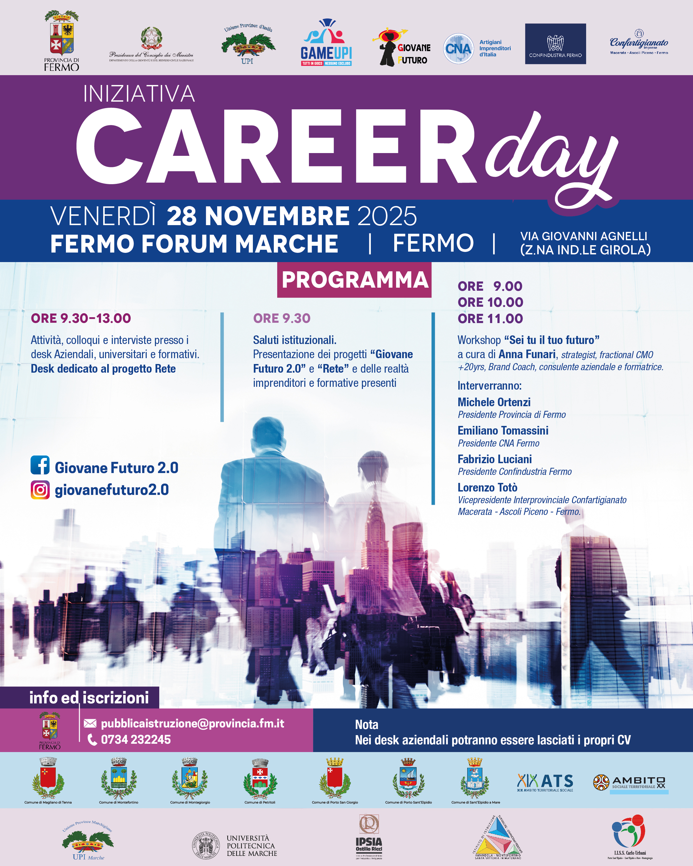 Il programma prevede tre momenti distinti, in tre location del Fermo Forum. Uno spazio è dedicato a imprese, Università, ITS, agenzie di lavoro e al Progetto Rete promosso dal Ministero per lo Sport e i Giovani. Il secondo spazio è per la lectio della formatrice. Il terzo prevede un dialogo tra i vertici delle associazioni di categoria e il Presidente della Provincia di Fermo. Gli studenti, divisi in gruppi, passeranno da una sala all’altra.